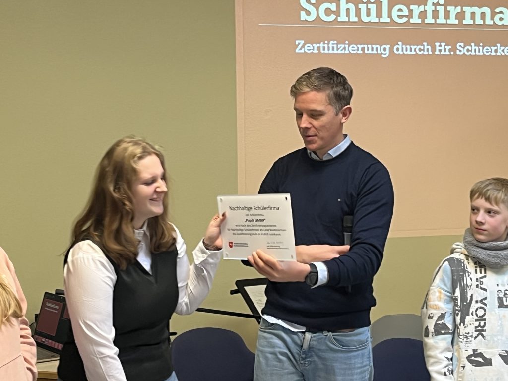 Die Verleihung fand im Rahmen eines Schülerforums statt. Janosch Schierke vom Regionalen Landesamt für Schule und Bildung (RLSB) überreichte die Auszeichnung in seiner Funktion als Regionalkoordinator für nachhaltige Schülerfirmen. In seiner Laudatio hob er den vorbildlichen Einsatz der Projektgruppe hervor und betonte, wie wichtig solche Initiativen für eine zukunftsorientierte Bildung seien. Die Schülerfirma ist bereits landesweit bekannt und findet Anerkennung in dem Koordinatoren Team.